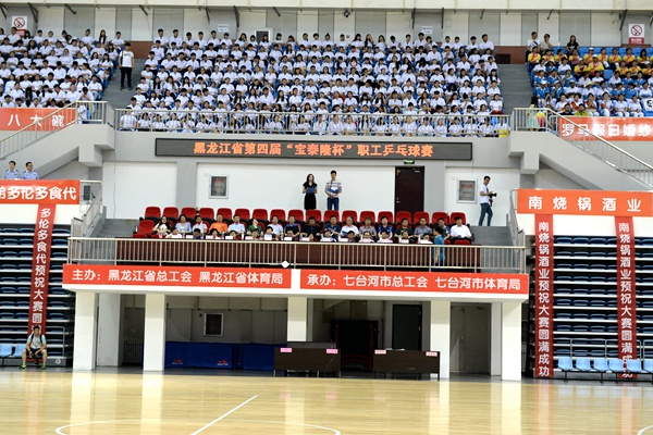 | 本报6月16日讯(记者韩黎黎)今天上午,全省第四届“宝泰隆杯”职工乒乓球赛在我市体育会展中心隆重开幕。省总工会副主席王淑霞、省体育局副局长李峰和韩库、曲焱、张建伟、刘婉、高明等市矿领导以及兄弟地市工会领导出席开幕式。 市人大常委会副主任、市总工会主席曲焱主持开幕式。 市委副书记韩库致欢迎辞。他说,多年来,省总工会、省体育局等省直单位和各兄弟地市,对七台河发展给予了极大的支持和强有力的帮助,在此我代表七台河市委、市政府及全市人民,再次向多年来关心支持七台河发展的各级领导和社会各界表示谢意。作为东道主,我们将竭尽全力,做好各项服务保障工作,为比赛创造良好条件。同时,我们将以此次比赛为契机,加强与各兄弟地市的交流探讨,增进友谊,深化合作,携手推动城市之间共同发展,向着更高、更快、更好的目标迈进。 李峰致开幕辞。他说,本次赛会是展示我省职工体育健身运动、检阅全省职工精神风貌的盛会。希望所有参赛运动员在比赛中牢固树立注重锻炼、相互学习、增进友谊、快乐健身的宗旨,切实遵守竞赛规则,赛出我们龙江职工的新风貌。 据了解,本届比赛为期3 天,共有67 支代表队、近400 名职工参加。参赛人员来自全省13 个市(地)、省直机关、企事业单位、各产业工会。  | | 全省第四届“宝泰隆”杯乒乓球赛比赛场地 |  | | 全省第四届“宝泰隆”杯乒乓球赛开幕式 |  | | 出席开幕式的省、市领导 |  | | 市委副书记韩库在开幕式上讲话 |  | | 曲焱致开幕词 |  | | 参加比赛的各代表队 |  | | 开幕式太极表演 |  | | 球员比赛场景 |