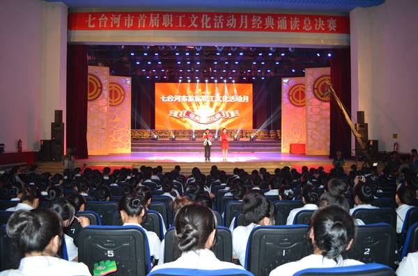 | | 七台河市首届职工文化活动月经典诵读总决赛现场 |  | | 市矿领导曲焱、高明与职工们一起观看演出 |  |  |  |  |  | | 市总工会、矿区工会机关干部诵读《祖国啊,我亲爱的祖国》 |