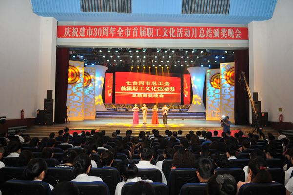 7月1日,矿区文化宫内灯光璀璨、笑声不断、掌声连连,庆祝建市30周年全市首届职工文化活动月总结颁奖晚会隆重举行。佟朋、曲焱、郑君桥、刘婉、高明等市矿领导观看演出并为获奖选手颁奖。 晚会上,来自各条战线的职工代表表演了精彩的文艺节目,充分展示了我市职工健康向上的精神风貌和为七台河发展建功立业的决心与信心。晚会高潮迭起,铁东选煤厂的音乐快板《三十年礼赞》、市第十小学的职工健身操表演、龙洋焦电有限责任公司的男声四重唱《我要去延安》、市第九中学的经典诵读《梅兰竹菊》等节目博得了现场观众的阵阵掌声。 据悉,以“爱岗位、爱生活、爱七台河”为主题的首届职工文化活动月从4月下旬开始筹备,历时两个月的时间,在全市掀起了职工文化热浪。本次活动由市总工会主办,包括职工健身操比赛、经典诵读比赛、美术书法摄影展、微博大赛、礼仪风采大赛等,内容丰富多彩,活动形式灵活多样,各单位认真组织,广大职工踊跃参与,全面唱响了“工人伟大、劳动光荣”的时代主旋律。(韩黎黎)