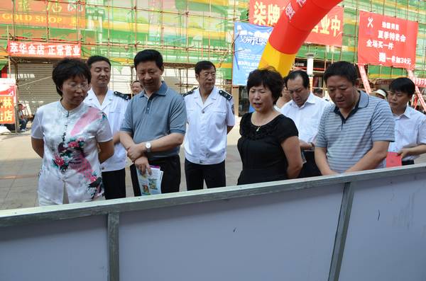 | | 曲焱为过往群众发放宣传册 |  | | 市领导一行参观市总工会展板 |