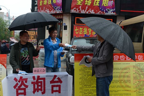 为达到预期宣传效果,市总工会在繁华地段设立了彩虹门、咨询台,为前来咨询的群众答疑解惑,并为过往群众发放宣传单和宣传册以及职工应知应会