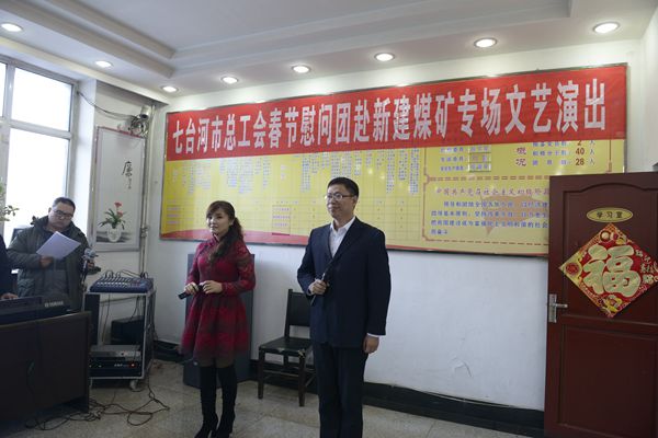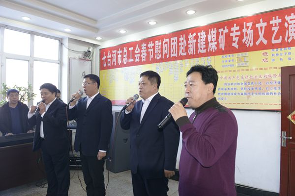 本报2 月16 日讯(记者韩黎黎)今天下午,市总工会组织职工业余合唱团走进新建煤矿慰问演出。市人大常委会副主任、市总工会主席曲焱,龙煤七矿公司党委副书记、矿区工会主席高明与新建矿干部职工一同观看了演出。 本次慰问演出节目丰富多彩,表演者用嘹亮的歌声一次次点燃现场激情,引发观众强烈共鸣,赢得阵阵热烈掌声。整场演出在《咱老百姓》的歌声中拉开帷幕。配乐诗朗诵《工人兄弟》、男生合唱《咱们工人有力量》、黄梅戏选段《天女散花》等精彩节目轮番上演,不断把演出推向高潮。 据了解,市总工会职工业余合唱团成立于2015 年5 月,由全市各系统、各单位爱好文艺表演的干部职工组成,在丰富干部职工业余文化生活的同时,还为广大干部职工提供了一个学习交流的机会和展示风采的舞台。如今,合唱团已经从最初的三十几人发展到现在的近200 人,并多次参加各种演出,深受广大市民好评。  | | 曲焱、高明等市矿领导与新建矿干部职工一同观看演出 |  | | 男生合唱《咱们工人有力量》 |  | | 演唱《为了谁》 |